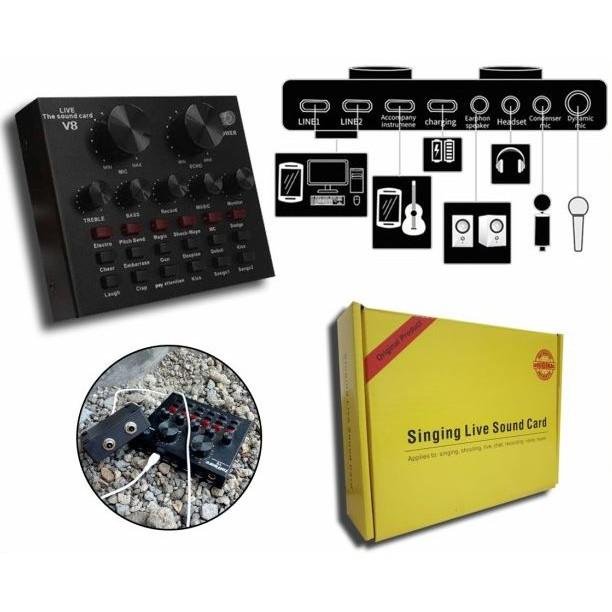 Sound Card V8 adalah audio mixer eksternal yang berfungsi untuk mengatur suara mic, musik, dan efek secara real-time. Perangkat ini sering digunakan untuk: